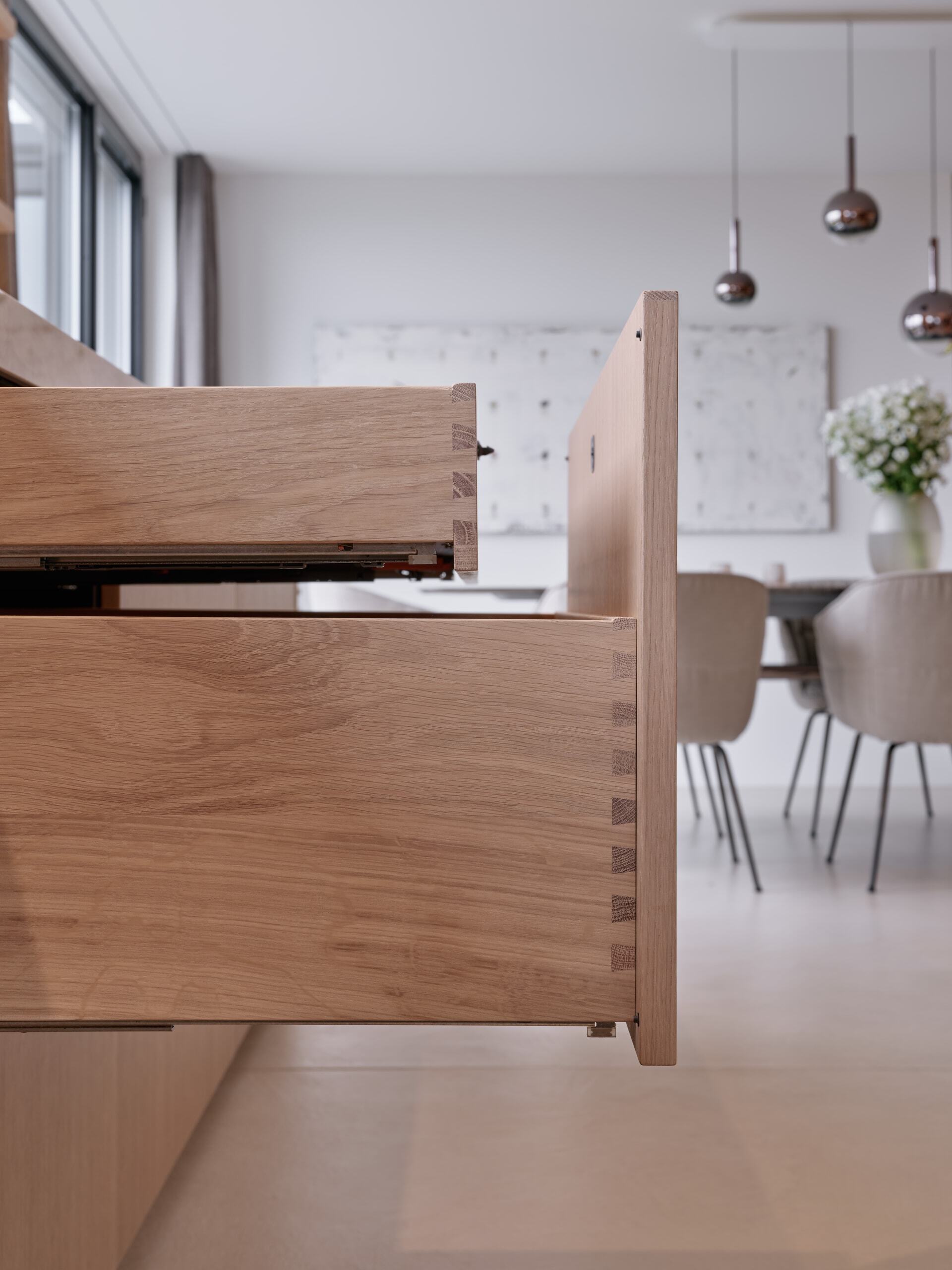 Die Küchenfronten aus furnierter Fineline-Eiche und die massiven Holzschubladen mit Schwalbenschwanzzinken schaffen eine zeitlose Ästhetik.