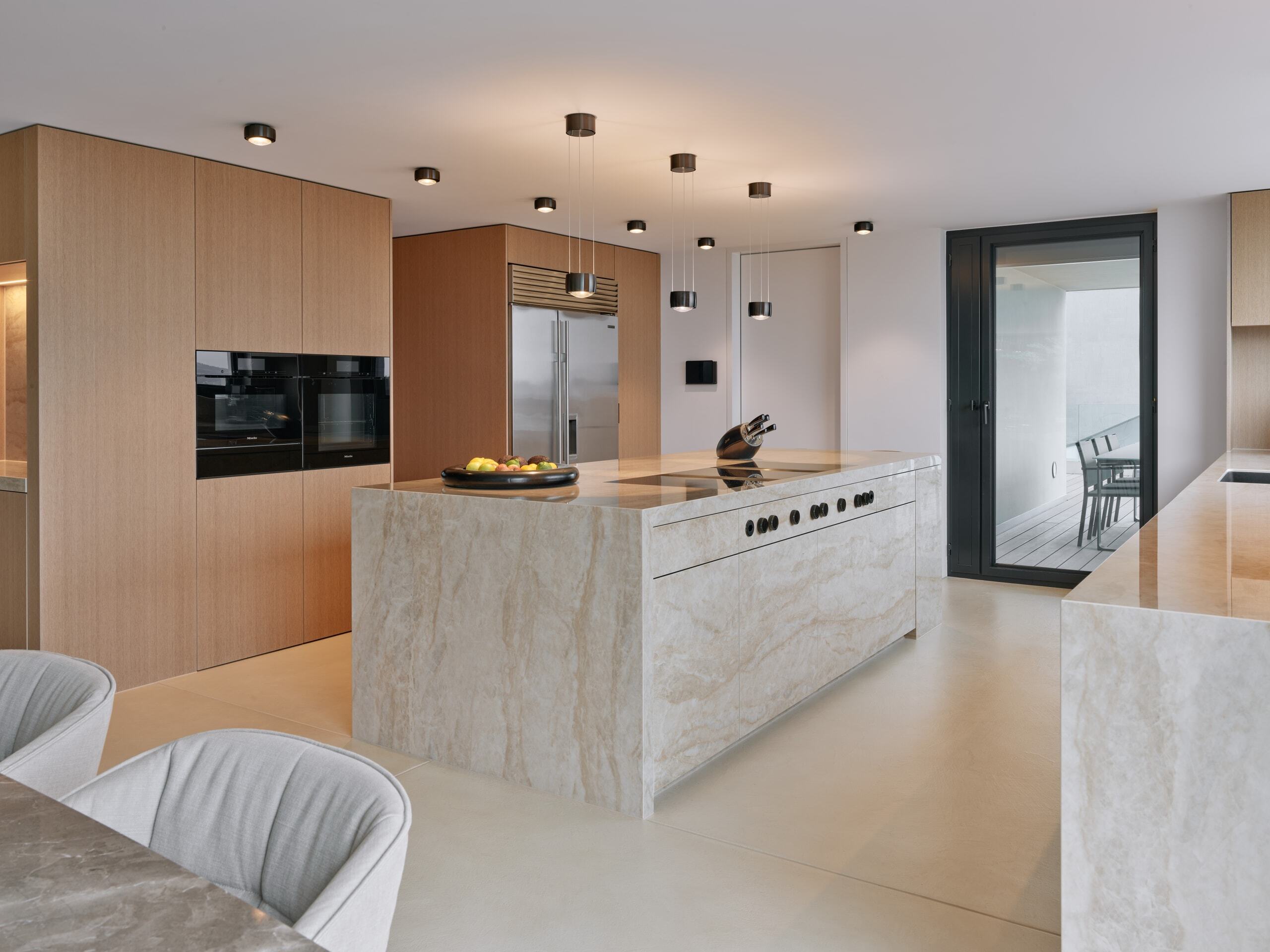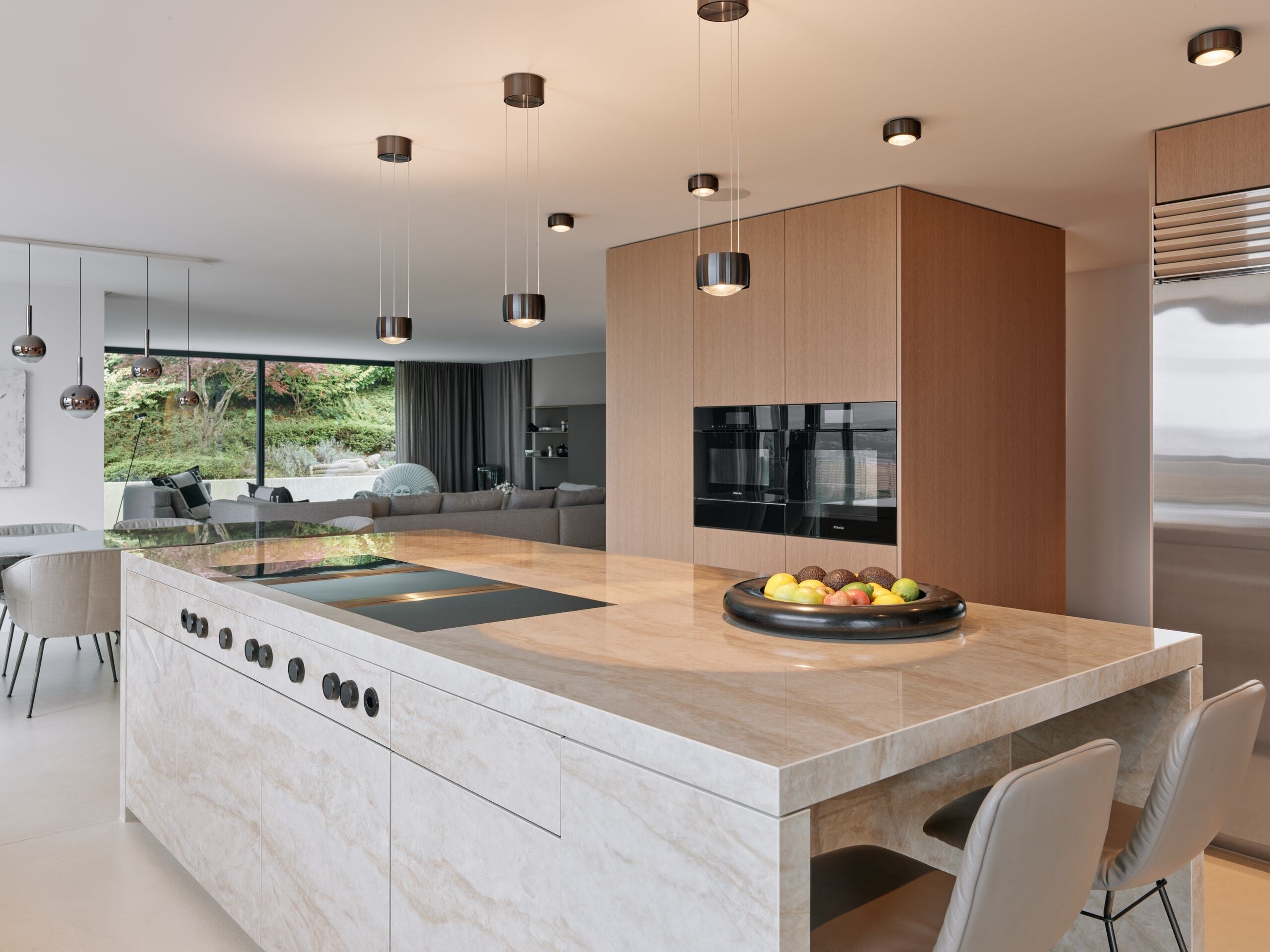 Parallel zur Wandzeile steht die monolithische Kücheninsel in Dekton-Keramik mit Natursteineffekt und integriertem Bora-Kochfeld. Das Ganze wird durch die Lichtführung der Occhio-Beleuchtung und die in den Holzelementen eingesetzten LED-Stripes perfekt in Szene gesetzt. Die Barnische auf der einen Seite lädt zum Verweilen ein, während Küchenschränke an den übrigen Achsen weiteren Stauraum bieten.