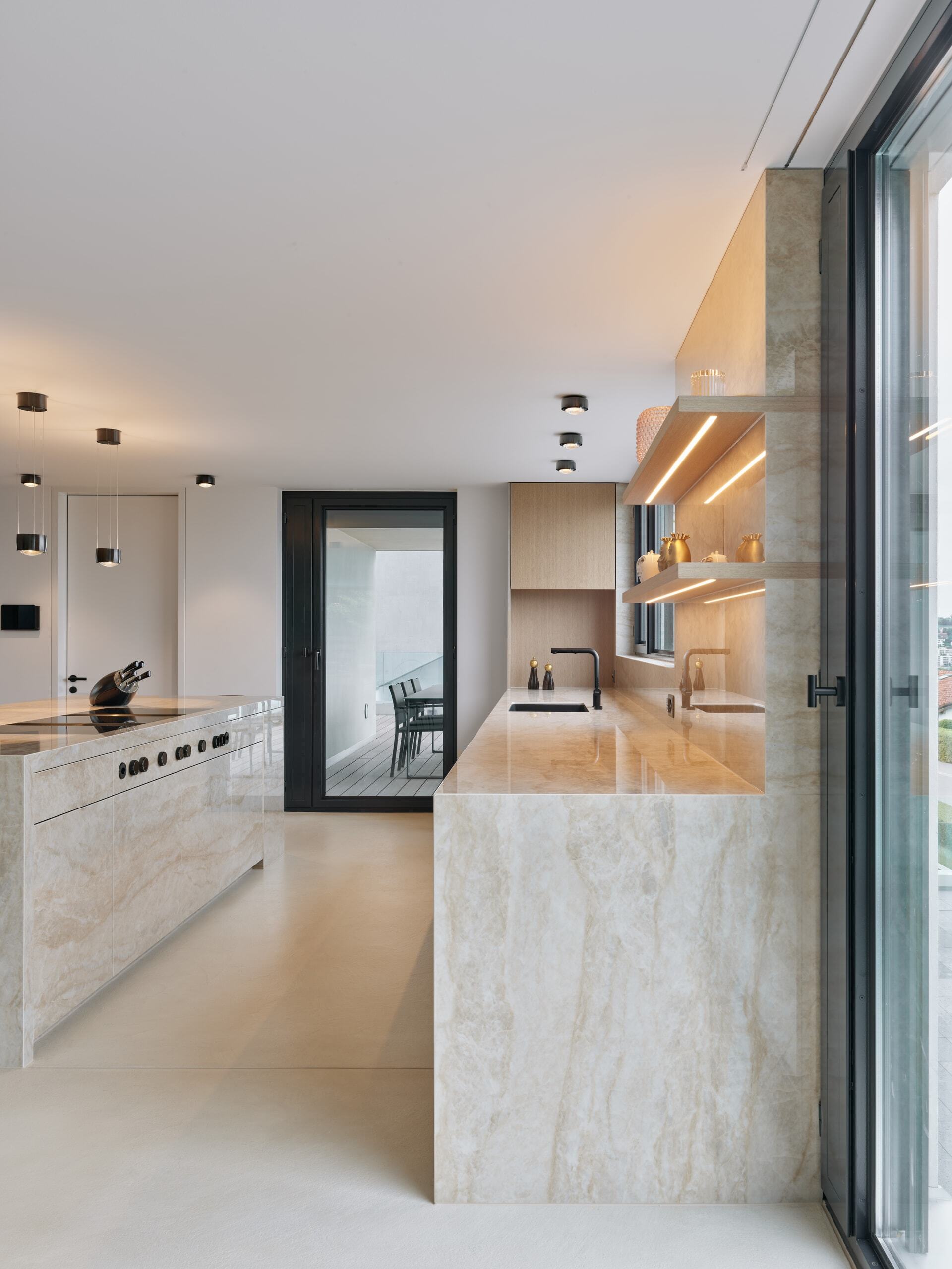 Die beleuchteten Tablare seitlich des Fensters durchdringen die Keramikrückwand und scheinen so im Raum zu schweben.