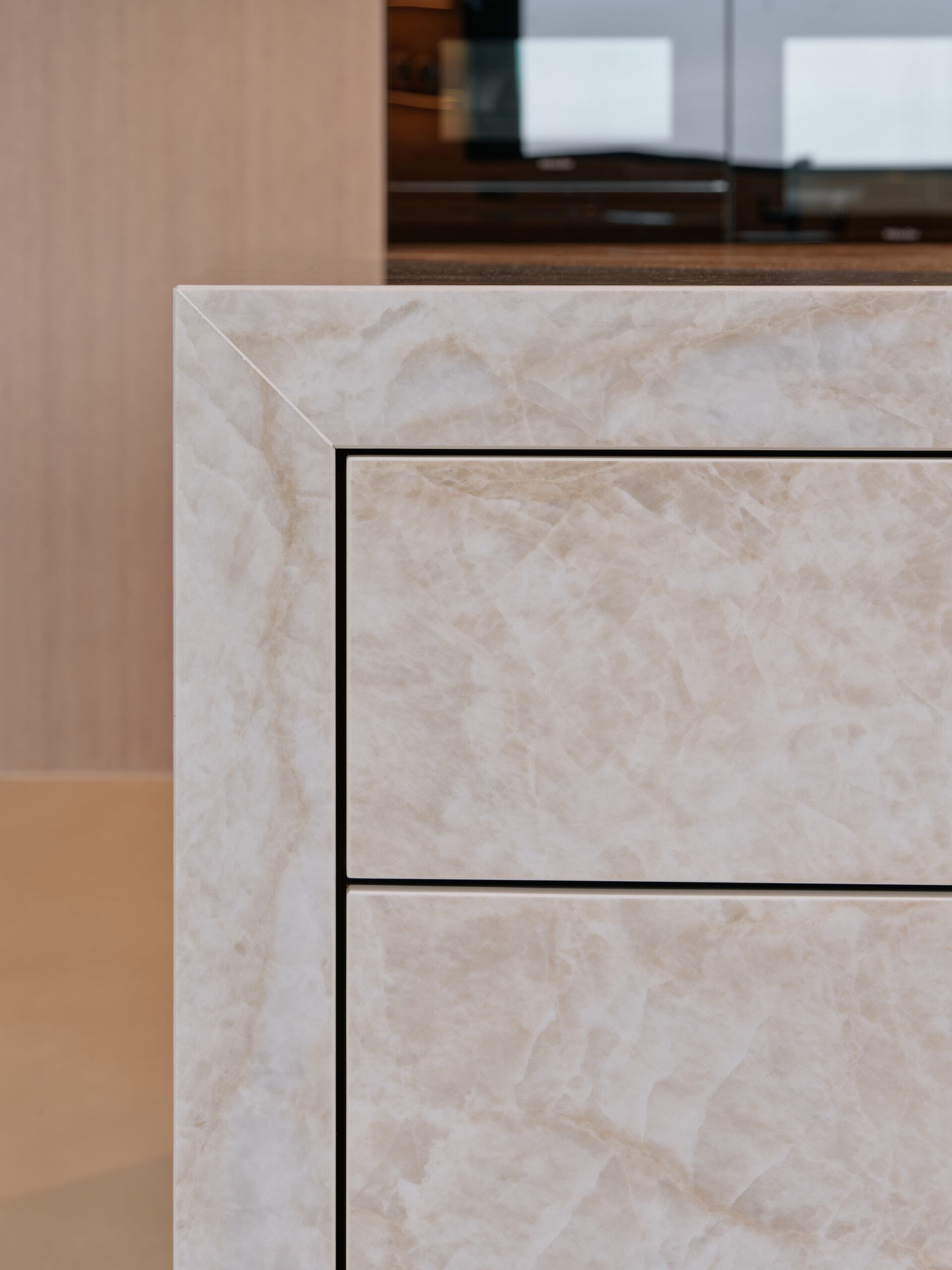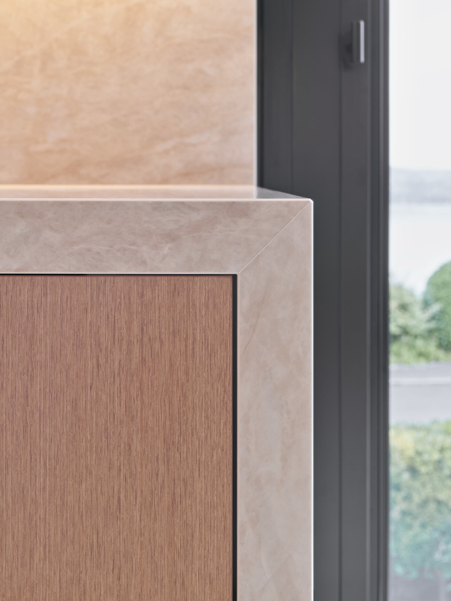 Die hochwertige Dekton- Oberfläche wurde auf Gehrung gefertigt und setzt so ein elegantes Statement.