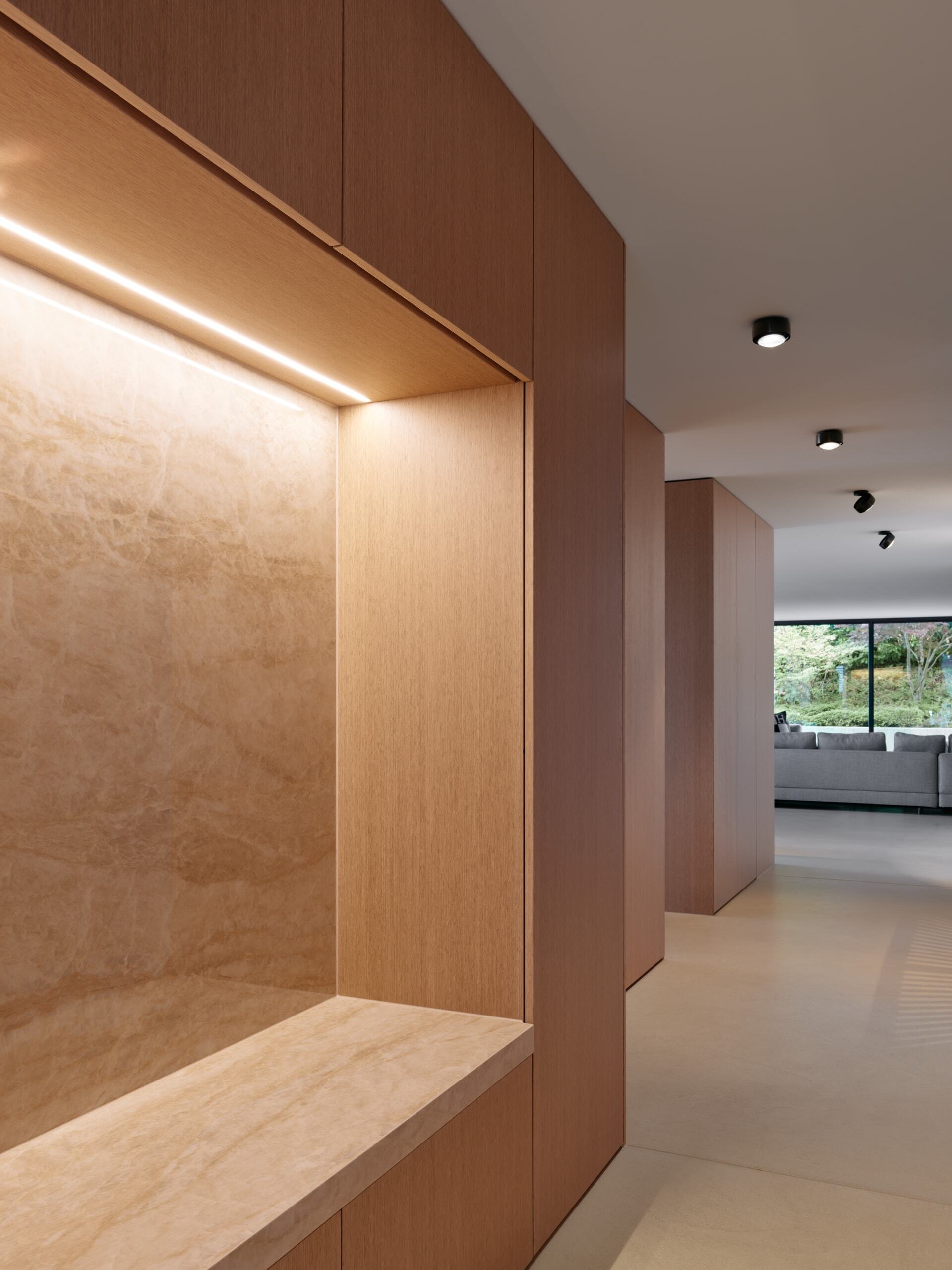 Um sowohl den Wohn- als auch den Essbereich zu einem Ensemble zu machen, wurde die Garderobe entsprechend der Küche geplant. Die Schränke sind, wie die Küchenfronten, aus furnierter Fineline- Eiche gefertigt und rahmen die Dekton- Platte, mit der die Garderobe ausgekleidet wurde, ein.